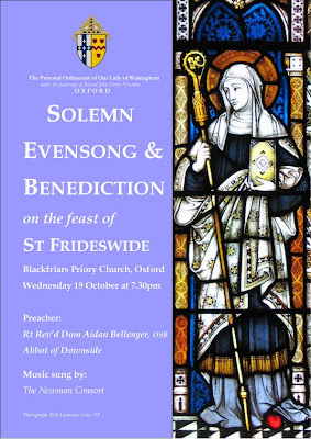 The Ordinariate of Our Lady of Walsingham was created by Pope Benedict as a means of enabling Anglicans to enter into full communion with the Catholic Church. The service of Evensong forms an essential part of what the Holy Father has called ‘Anglican patrimony’ and the Vatican, in an historic move, has authorised its use by the Ordinariate. This service of Evensong for the feast of St. Frideswide, Patroness of the University and City of Oxford, will be one of the first occasions in which the new liturgy is solemnly used. The Celebrant will be Monsignor Andrew Burnham (who will speak to the society later this term) and the Preacher will be the Rt. Rev. Aidan Bellenger, Lord Abbot of Downside. The service will be followed by a drinks reception, to which all are invited.